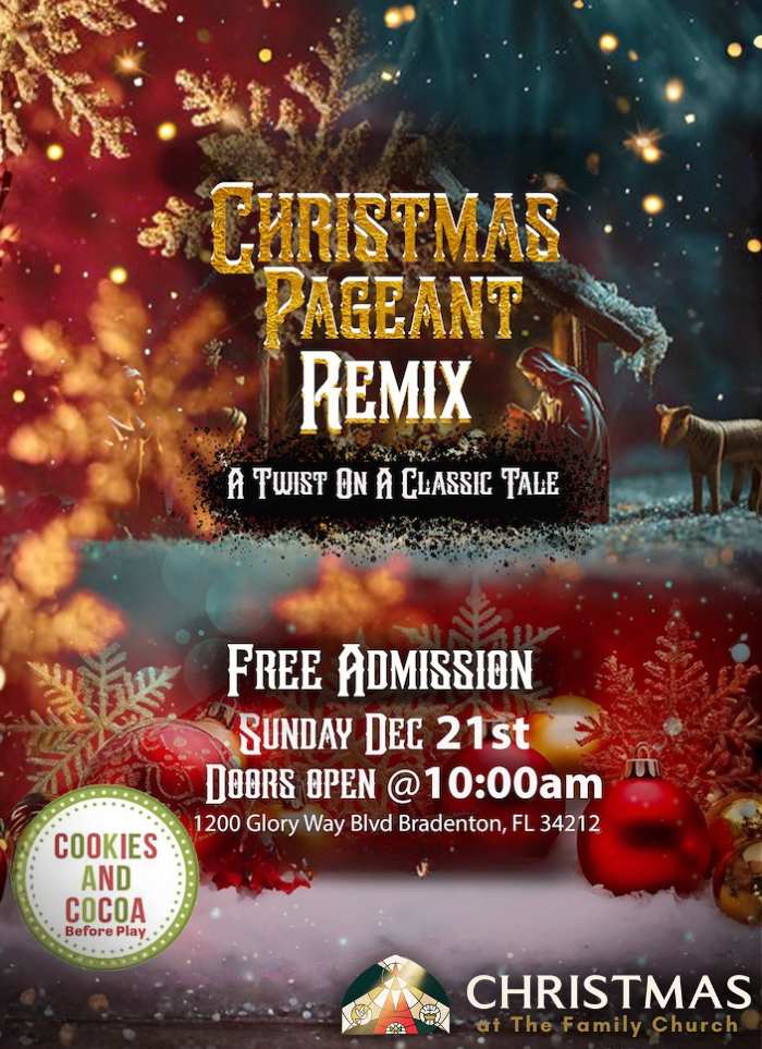 The Family Church presents the Christmas Pageant Remix, a play production that takes the classic story of the birth of Christ and adds a comedic twist. With its vibrant neon colors, breathtaking fine art dances, and dramatic performances, the show is set to the enchanting sounds of Christmas. It’s an unforgettable experience that will delight the whole family. Don’t miss out on the opportunity to join us for cocoa and cookies before the doors open.